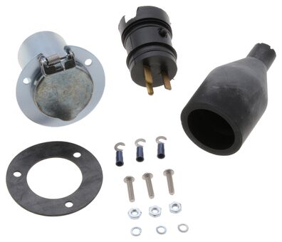 Kit includes: 1 Zinc plated, round 3-hole mount receptacle, 1 240 Volt 15 Amp plug that mates to the receptacle, and 1 heavy gauge rubber boot to seal the electrical connections.